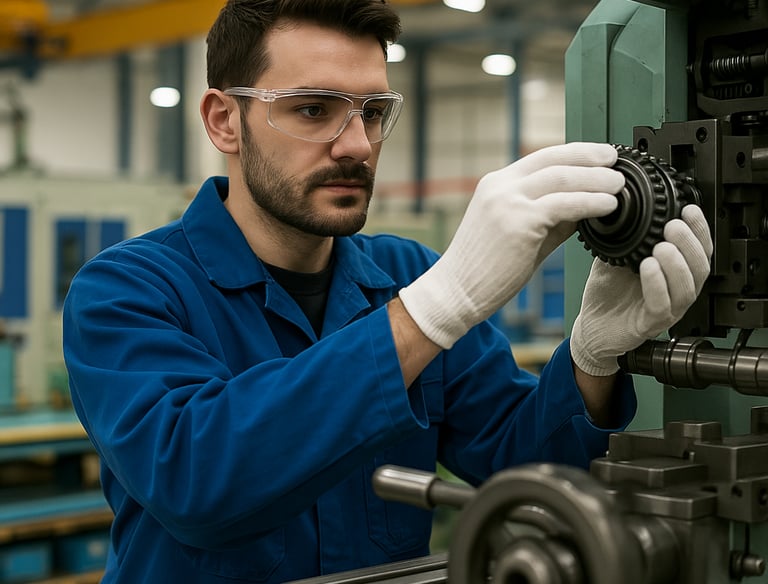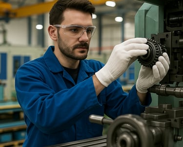 Processo de instalar e configurar máquinas industriais, como motores ou linhas de produção, ajustando e testando pra garantir operação segura e eficiente.