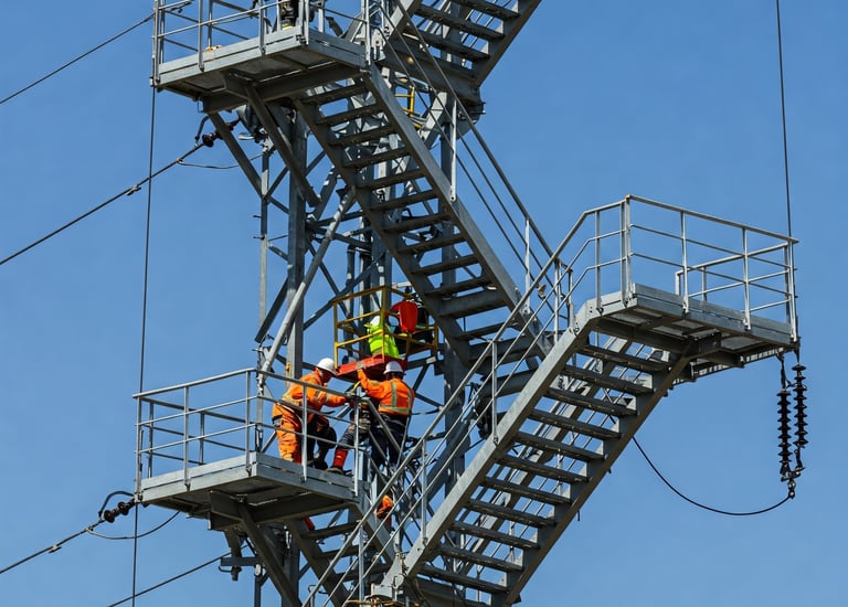 Processo de instalação de escadas metálicas em torres de transmissão ou distribuição de energia elétrica, para permitir o acesso seguro de técnicos e eletricistas às partes elevadas da estrutura.